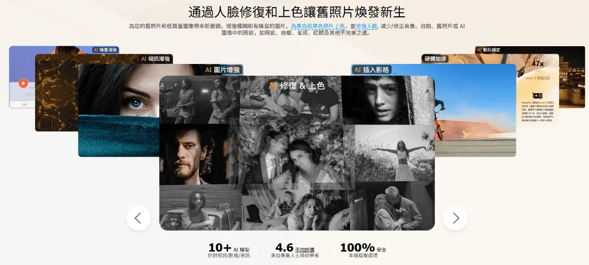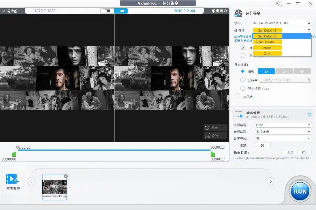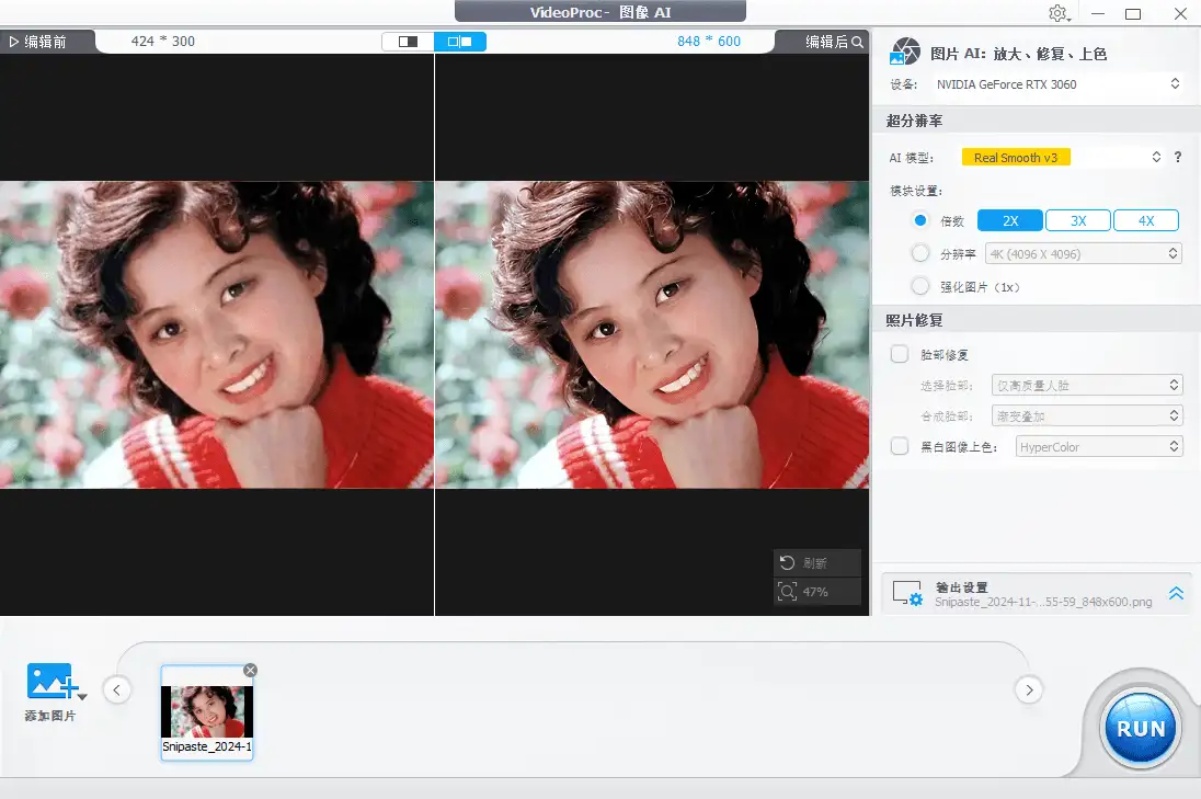 • 支持4K视频高清修复、图片无损放大、老照片上色等,而且支持GPU加速