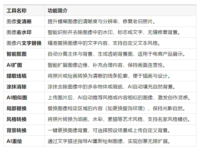 - 功能丰富:支持几乎所有可以想到的Ai图片处理,一共12种,具体如下方展示