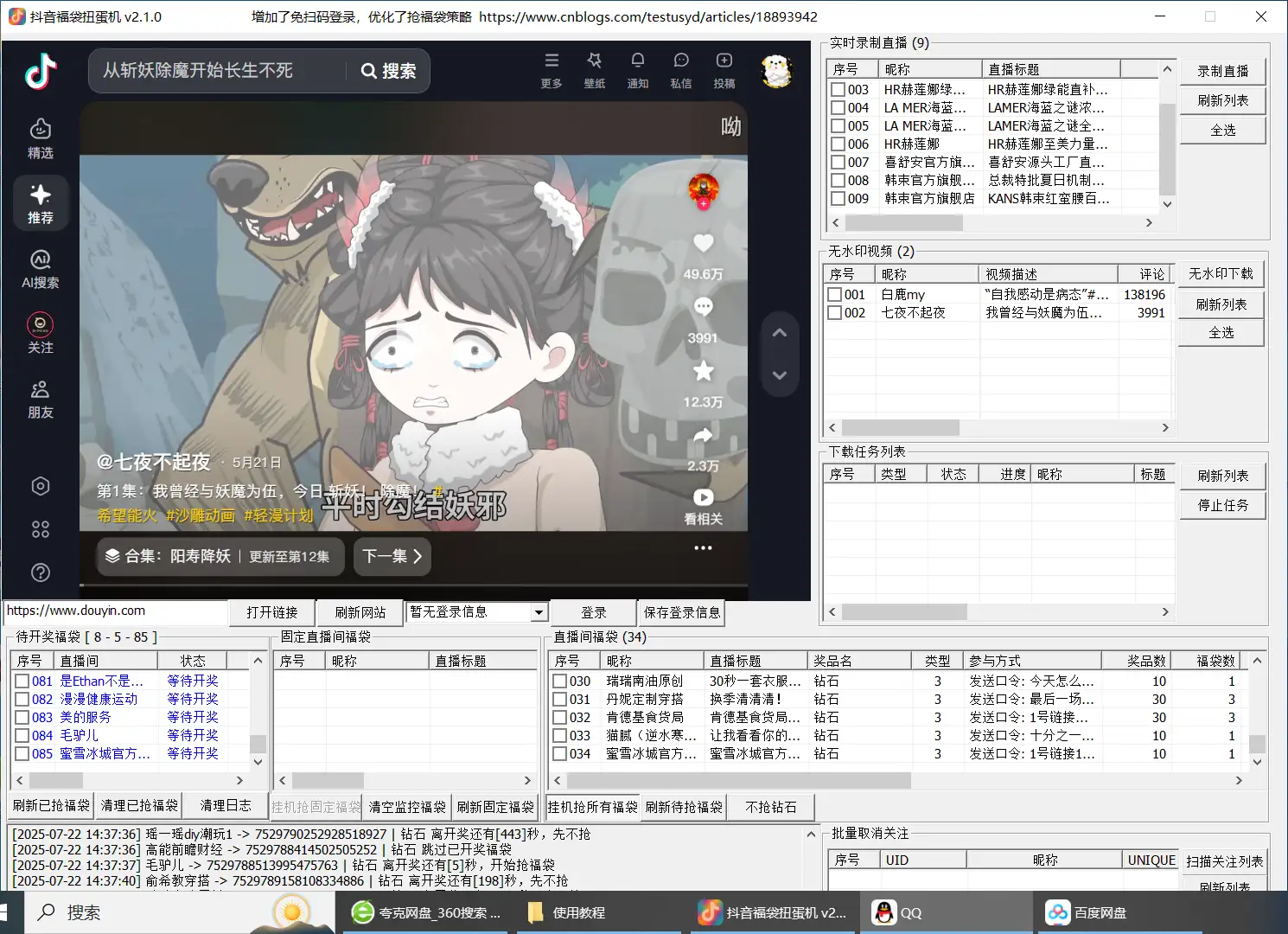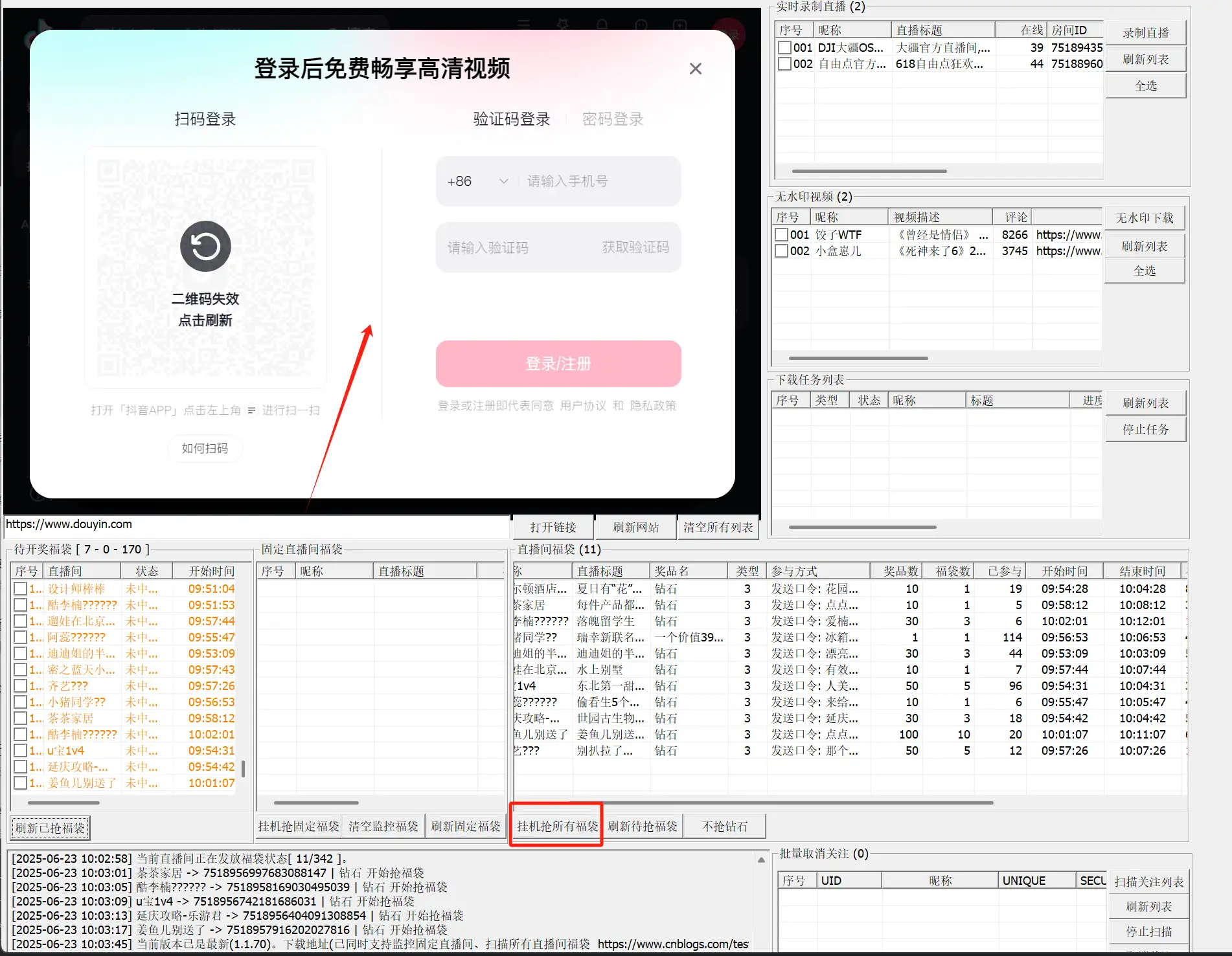 - 2.直播间抢福袋功能,目前支持扫描平台所有直播间,并过滤出正在发放福袋的直播间进行参与。