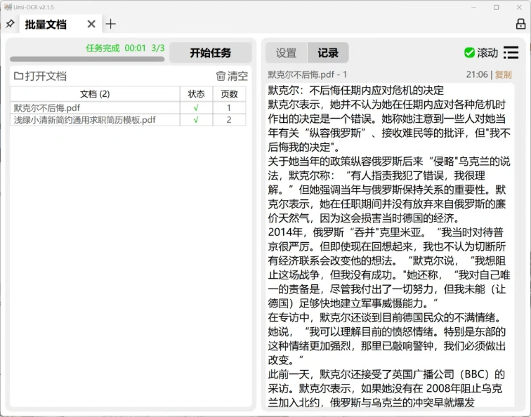 • 批量文档:PDF文档OCR的功能,经常有小伙伴求软件,其实这个Umi-OCR就有文档识别的功能,而且还支持批量。