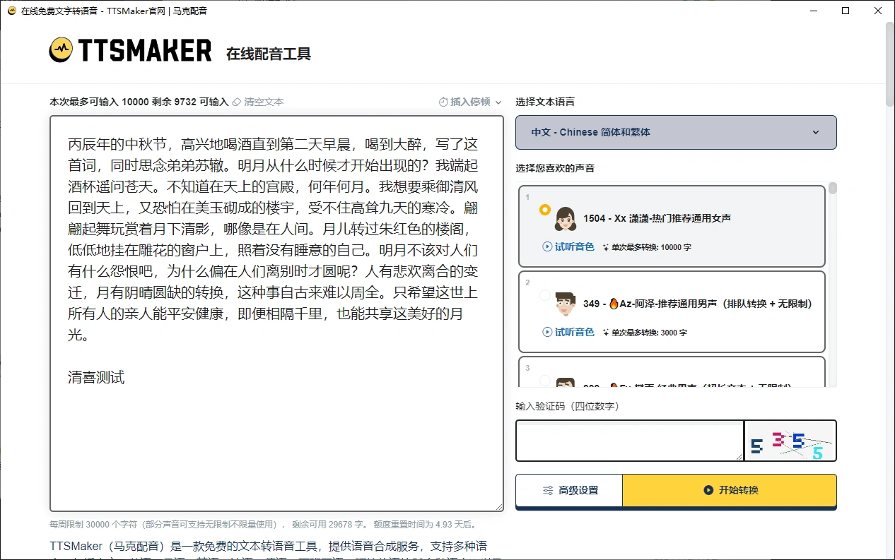 - 所有配音免费可商用,每周限制 30000 个字符(部分声音可支持无限制不限量使用)