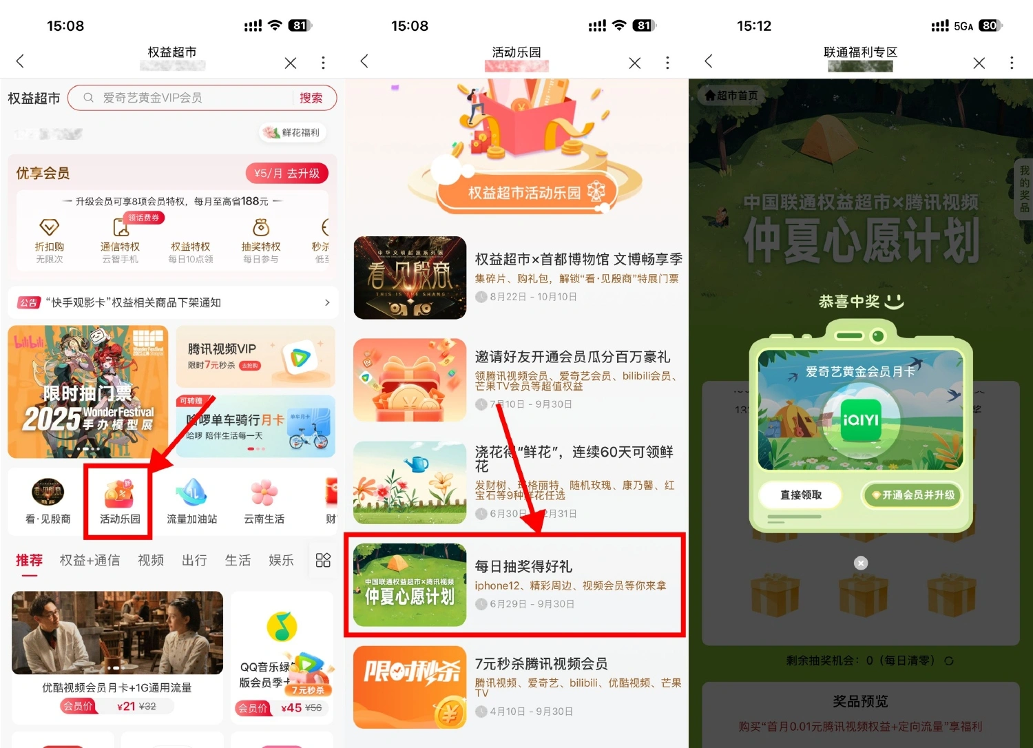 - 联通APP搜索“权益超市”->活动乐园->仲夏心愿计划->简单浏览得次数,抽爱奇艺或腾讯视频会员等奖励